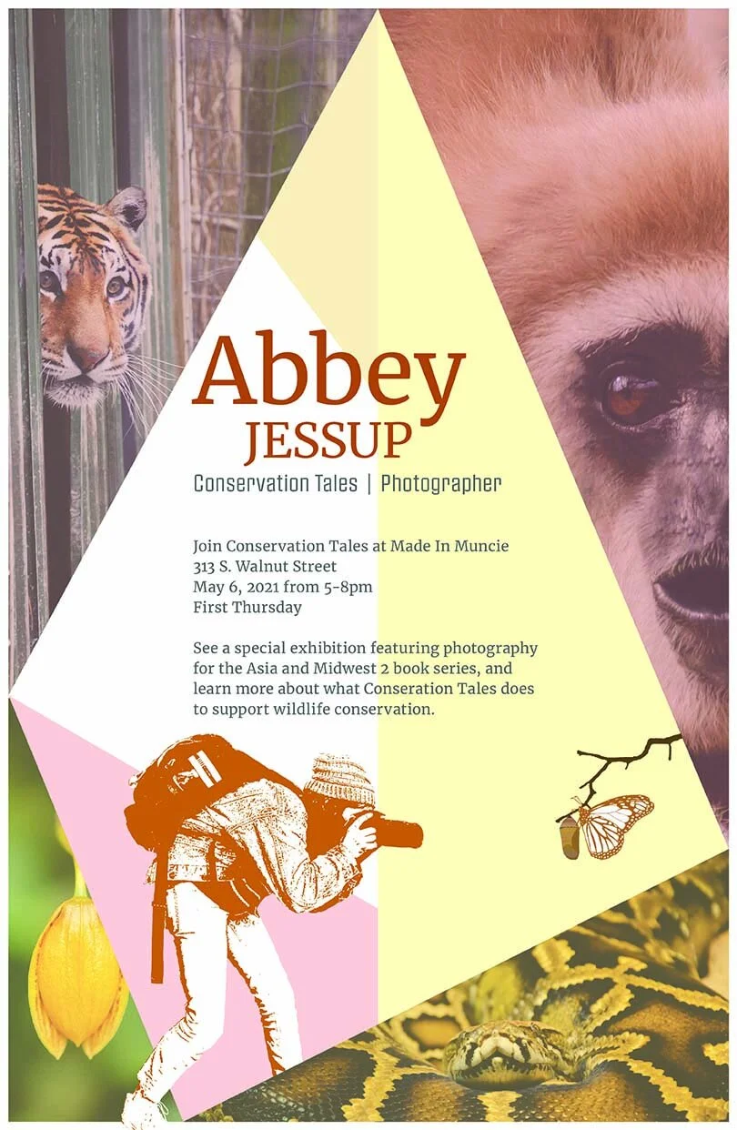 Subtly calling to the shape of a butterfly’s chrysalis, this poster gives viewers a sneak peek to the photography of Abbey Jessup as well as inviting them to come view the exhibition of her work.