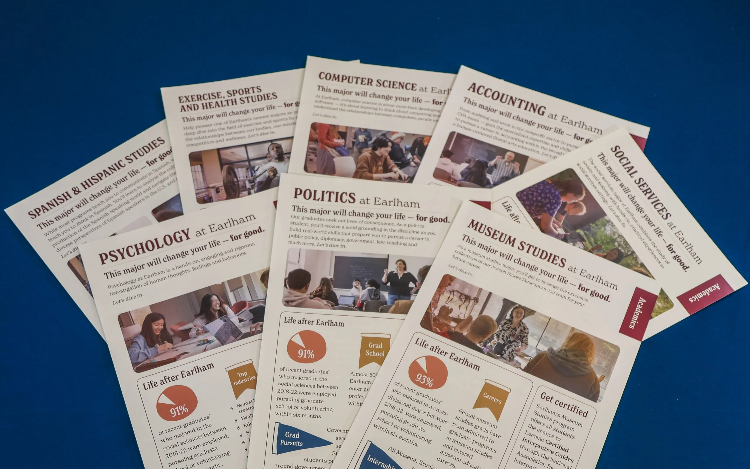 The goal of the Admissions folder redesign was to find a way to highlight the best features of each academic major, allowing fluidity for sections. I designed a modular layout that was easily adapted to each major. Working from sketches through design iterations, we arrived at a sheet layout that could be quickly scanned by prospective students and their parents to find information and answer questions about a major. The design also incorporated the brand refresh, which brought more variety of colors and a characteristic serif font. Lastly, the photography needed a filter for the sheet to look unified. To tone down the sharpness of the photos, I developed a custom filter that was applied to each photo. The result was a cohesive, informative, and brand-aligned look, further enforcing Earlham's unique academic opportunities.